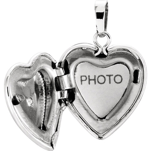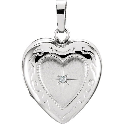 Polished 14k white gold locket has a diamond accent in the center. Item dimensions: 13.5mm x 12.75mm. It is half the size of a quarter. Diamond details: 1 x 1.15mm round full cut diamond, I3 clarity. Locket weighs 1.84 grams.