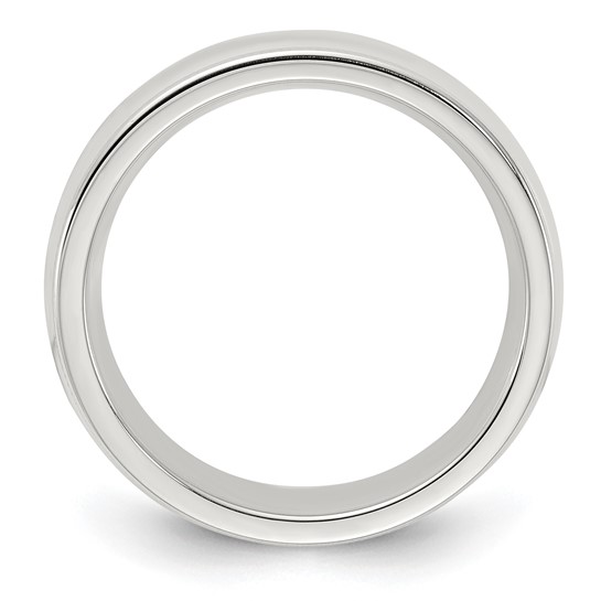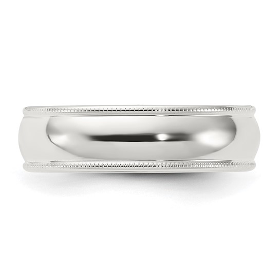 Sterling silver 6mm comfort fit wedding band has a domed center and milgrain edges. Polished finish. Made in USA. Thickness: 2.5mm. Available in half and whole finger sizes only, 4-12. Size 10 ring weighs approximately 9.0 grams.
