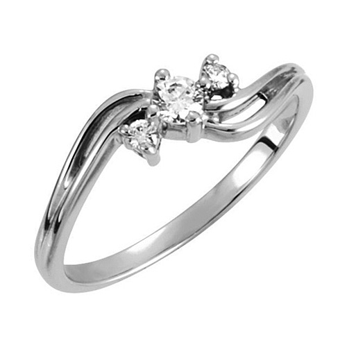 14kt white gold promise ring is set with three genuine diamonds. Two .02 ct round diamonds and one .10 ct round diamond. Diamond details: G-H color, SI1 clarity. Made in USA.