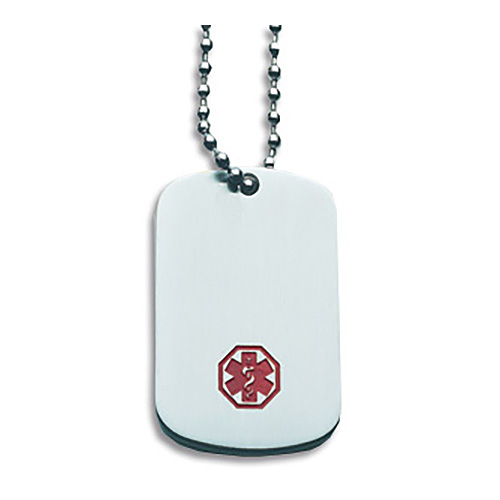 Solid hypo-allergenic stainless steel medical necklace pendant. Measures 7/8 inch wide by 1 3/8 inch tall. Attractively packaged with medical wallet card. Made in USA. 26 inches long. Engravable. All medical jewelry engravings are custom engraved on the back of the piece unless otherwise specified.