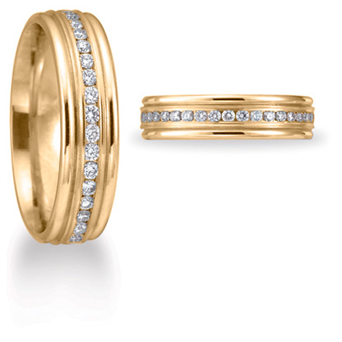 Benchmark eternity 3/4 carat total weight diamond wedding band has rounded edges and is made of 14k yellow gold. Comfort fit wedding band is 6mm wide. 36 x .02CT round brilliant diamonds. Diamond color G, clarity SI1. Channel set diamonds all the way around the ring are carefully matched and subject to stringent inspection. Precision-set. Made in USA.The Perfection of Precision SettingBenchmark is one of the few manufacturers to master the technology behind precision-setting. Our process allows as much of the diamond's surface to be displayed while also providing superior security for the stones. Hand-set diamonds are often inconsistently secured and have an uneven surface. Benchmark bands are engineered for perfection. Our customers have come to expect the best, and we take pride in delivering it every day.