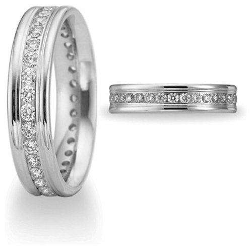 This ladies' 3/4 carat total weight diamond eternity wedding band is made of platinum. Comfort fit with rounded edges. Width: 4mm. 36 x .02CT round brilliant diamonds. Diamond color G, clarity SI1. Channel set diamonds all the way around the ring are carefully matched and subject to stringent inspection. Precision-set. Flat band, Solid platinum 950 [95% Platinum, 5% Ruthenium alloy] Made in USA.