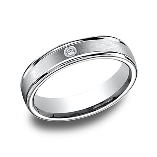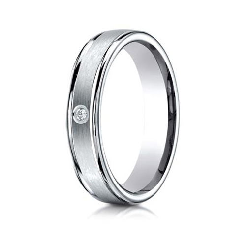 This 14k white gold wedding band has a single bezel set diamond and polished rounded edges. Ring width: 4mm. .02CT round brilliant diamond, G color, SI1 clarity. Precision-set. Satin center. Die struck and comfort fit. Made in USA. This ring is made from 100% recycled gold, sourced directly from suppliers with Scientific Certification Services recycled content certification.