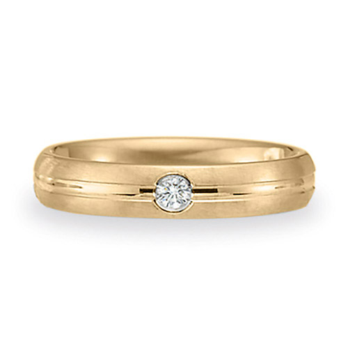 14kt yellow gold diamond wedding band is die struck and comfort fit. 1 x .06CT round brilliant diamonds. Diamond color G, clarity SI1. Diamonds are carefully matched and subject to stringent inspection. Precision-set. Polished center groove and satin finish edges. Width: 4mm. Solid 14kt yellow gold. Made in USA.