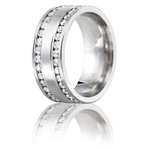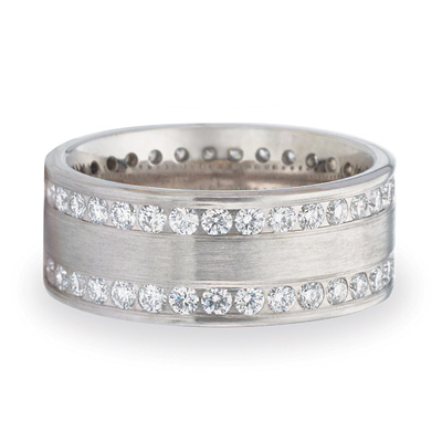Benchmark platinum 1.5 carat diamond wedding band has two rows of diamonds. Die struck and comfort fit. 74 x .02CT round brilliant diamonds. Two rows of diamonds encircle each band. Diamond color G, clarity SI1. Diamonds are carefully matched and subject to stringent inspection. Precision-set. Flat band, satin finish. Width: 8mm. Solid platinum 950 [95% Platinum, 5% Ruthenium alloy] Made in USA.The Perfection of Precision SettingBenchmark is one of the few manufacturers to master the technology behind precision-setting. Our process allows as much of the diamond's surface to be displayed while also providing superior security for the stones. Hand-set diamonds are often inconsistently secured and have an uneven surface. Benchmark bands are engineered for perfection. Our customers have come to expect the best, and we take pride in delivering it every day.Benchmark Lifetime GuaranteeIf your ring is ever damaged during normal wear, Benchmark will repair or replace your wedding ring free of charge. If your finger size ever changes, Benchmark will resize or replace your ring free of charge. In the case that Benchmark has to add material to your ring, you will only be charged for the difference in the additional metal or stones needed to restore the piece. Guarantee ParametersThe guarantee does not cover rings that have been ordered in the wrong finger size or finger sizes that may have changed between the time of purchase and the actual physical receipt of the piece. Third party alterations, other than engraving, will void the warranty.Benchmark reserves the right to deny the Lifetime Guarantee for any ring that shows signs of abuse or tampering.