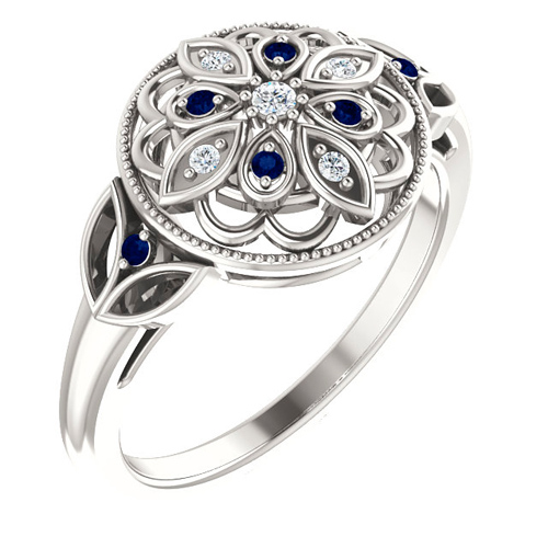 Polished sterling silver ring is adorned with blue sapphire and diamond accents. Gemstone details: 1 x 0.025 Ct (1.7mm), Blue Sapphire Round Gemstone Blue Sapphire, 4 x 0.008 Ct (1.2mm), I2 Round Diamonds, and 6 x 0.010 Ct (1.2mm), Blue Sapphire Round Gemstone Blue Sapphire. Available in whole finger sizes 5-8 only. Approximate weight: 3.4 grams.