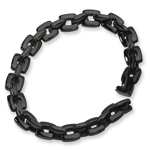 Black-plated stainless steel square link bracelet has a fold over clasp. Length: 9in. Weight: 61.15 grams. This bracelet is composed of grade 316 stainless steel, known for its superior corrosion resistance. 316 stainless steel is commonly used in stainless steel jewelry. Insist on 316 stainless steel. 316 steel is also known as marine grade stainless steel, for its high resistance to chloride corrosion. Stainless steel will not oxidize [rust] nor turn black. Imported.