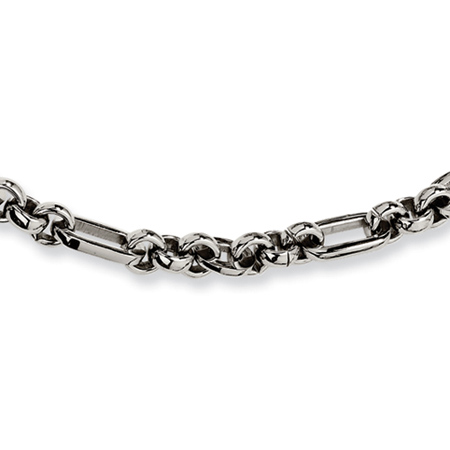 Fancy link, polished finish. Width: 8.7mm. Length: 20in. Fancy lobster clasp. Weight: 40.58 grams. This necklace is composed of grade 316 stainless steel, known for its superior corrosion resistance. 316 stainless steel is commonly used in stainless steel jewelry. Insist on 316 stainless steel. 316 steel is also known as marine grade stainless steel, for its high resistance to chloride corrosion. Stainless steel will not oxidize [rust] nor turn black. Imported.