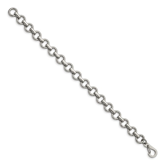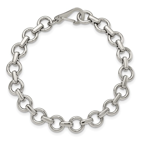 This men's stainless steel bracelet has circle links and a polished finish. Width: 9.3mm. Length: 8.25in. Fancy lobster clasp. Weight: 17.54 grams. This bracelet is composed of grade 316 stainless steel, known for its superior corrosion resistance. 316 stainless steel is commonly used in stainless steel jewelry. Insist on 316 stainless steel. 316 steel is also known as marine grade stainless steel, for its high resistance to chloride corrosion. Stainless steel will not oxidize [rust] nor turn black. Imported.