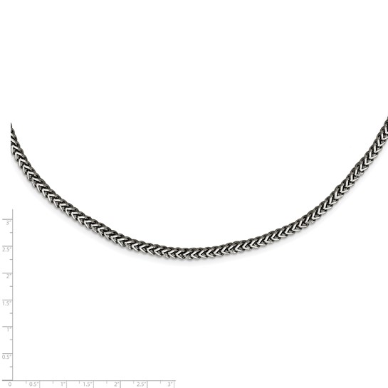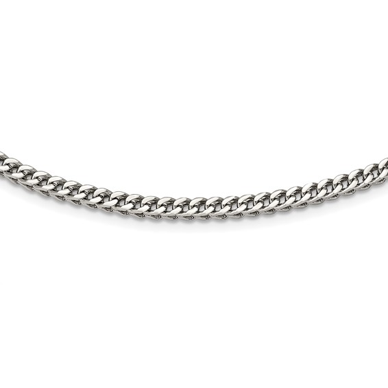 Stainles steel Franco chain has a fancy lobster clasp. Width: 4mm. Length: 24in. Weight: 32.90 grams. This necklace is composed of grade 316 stainless steel, known for its superior corrosion resistance. 316 stainless steel is commonly used in stainless steel jewelry. Insist on 316 stainless steel. 316 steel is also known as marine grade stainless steel, for its high resistance to chloride corrosion. Stainless steel will not oxidize [rust] nor turn black. Imported.