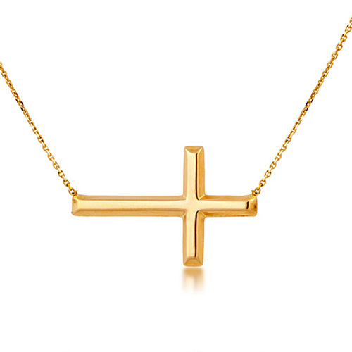 Hollow 1in sideways cross is made of polished, 14kt yellow gold. Cross is attached to an adjustable rope chain, 16in to 18in length. Lobster clasp. Chain width: .5mm. Item weight: 2.0 grams. Imported.