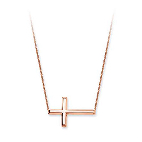 Hollow 1in sideways cross is made of polished 14kt rose gold. Cross is attached to an adjustable rope chain, 16in to 18in length. Lobster clasp. Item weight: 2.0 grams. Imported.