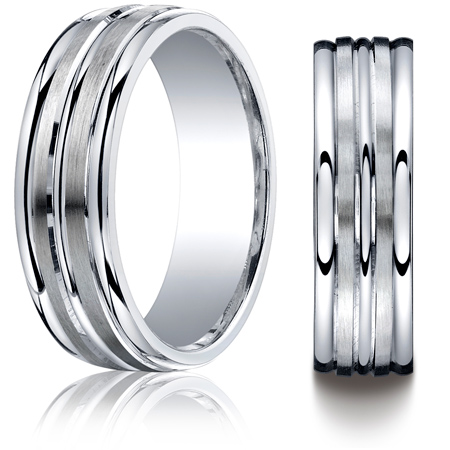 This band is made of Argentium Silver. Comfort fit band features a double-grooved satin-finished center with high polished round edges. Width: 7mm. Available in whole and half finger sizes, 6-14.Argentium is the most advanced silver alloy in the market. Argentium silver rings are tarnish-resistant and stronger than sterling silver offered elsewhere.