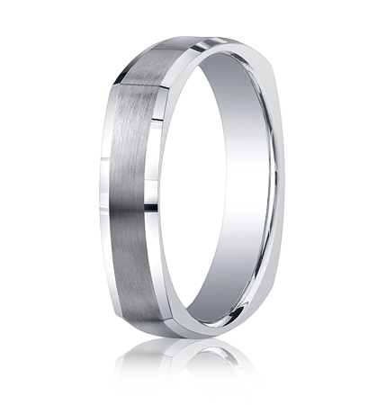 This Argentium silver 5mm wedding band has a four-sided design with a satin-finished center and polished beveled edges. Comfort fit. Made in the USA. Available in whole and half finger sizes, 6-14.Argentium is the most advanced silver alloy in the market. Argentium silver rings are tarnish-resistant and stronger than sterling silver offered elsewhere.