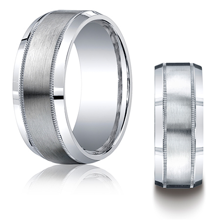 This band is made of Argentium Silver. Comfort fit band features a satin-finished center with milgrain design and high polished edges. Width: 9mm. Available in whole and half finger sizes, 6-14.Argentium is the most advanced silver alloy in the market. Argentium silver rings are tarnish-resistant and stronger than sterling silver offered elsewhere.