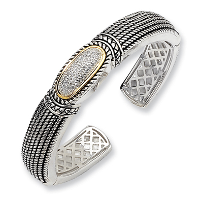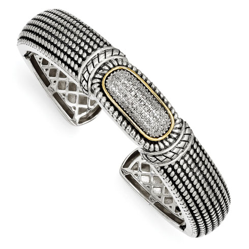 Antiqued sterling silver bangle features 1/4 CT TW round brilliant diamond accents. Gemstone details: diamond ? single cut round ? 50 x 0.005ct. Imported. Metal weight: 52.2 grams. One size fits most. Imported.