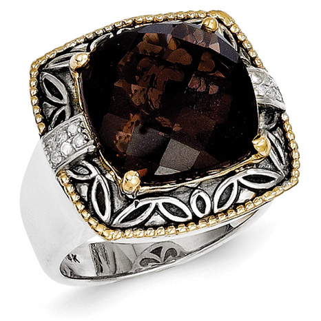 Sterling silver 9.76 carat cushion cut smoky quartz ring has 1/20 CT TW diamond accents. Stone details: 12 round diamonds at .005 carat each. The center stone is checker board (cushion cut) measuring 14 x 14mm. Antiqued sterling silver and 14k yellow gold accents. Imported. Available in size 7 only while supplies last. Metal weight: 12.81 grams.