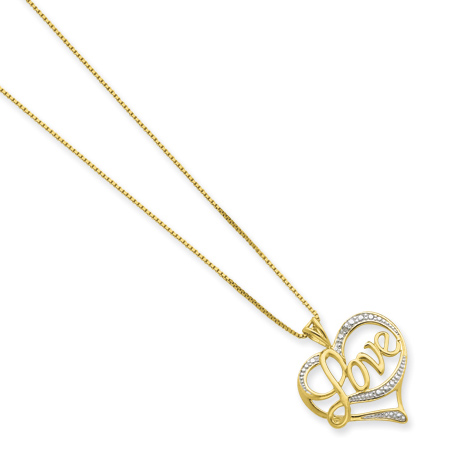 This genuine diamond Love necklace is made of gold-plated sterling silver. Diamond accents weight: .01ct. 16in gold-plated box chain with spring ring clasp. Pendant dimensions: 5/8in x 5/8in. Weight: 2.3 grams. Imported.