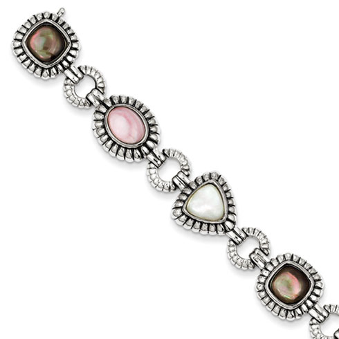 Antique sterling silver bracelet features pink, black and white mother of pearl. Length: 7.75in, one size fits most. Metal weight: 29.4 grams. Imported.