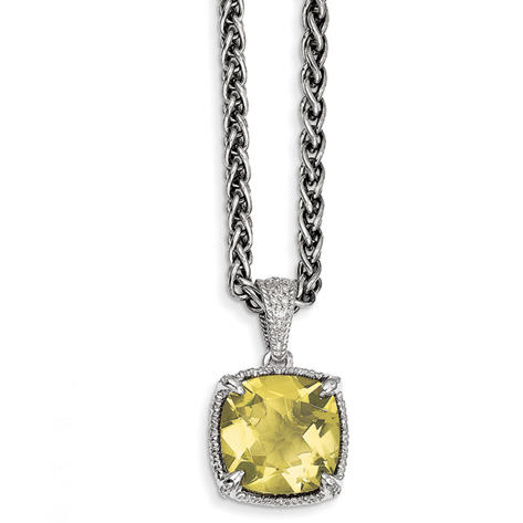 Delightful cushion cut lemon quartz and diamond necklace is set in antiqued sterling silver. 10 CT lemon quartz center stone is surrounded by 1/20 CT TW round brilliant diamond accents. 18in necklace includes chain as shown, lobster clasp. Metal weight: 21.9 grams. Imported. Available while supplies last.