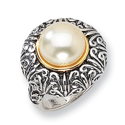 12mm freshwater cultured pearl ring with scroll design is made of antiqued sterling silver and 14k yellow gold accents. Standard fit. Metal weight: 13.8 grams. Available in whole finger sizes 6, 7 and 8 only. Import.