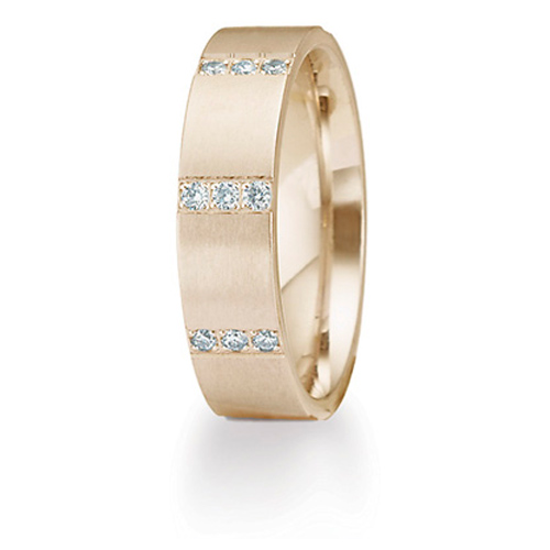 This 14k yellow gold men's 1/2 carat diamond wedding band has eight columns of diamonds all the way around. Ring width: 6mm. 24 x .02CT round brilliant diamonds. Diamond color G, clarity SI1. Flat center and satin finish. Die struck and comfort fit. Made in USA.