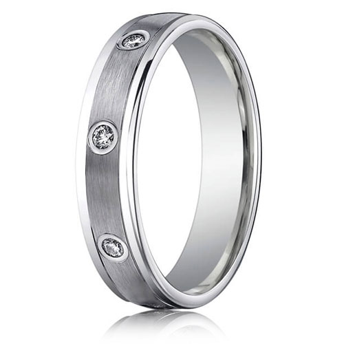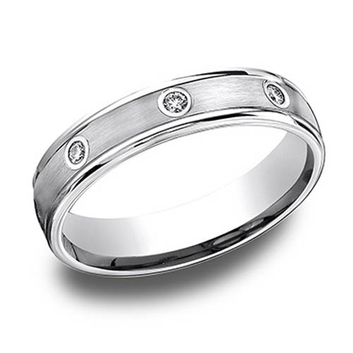 14k white gold 1/6 carat diamond wedding band has eight flush set diamonds spaced around the ring. Ring width: 4mm. Flat satin finish center and polished rounded edges. Die struck and comfort fit. 8 x .02CT round brilliant diamonds. Diamond color G, clarity SI1. Precision-set. Made in USA. This ring is made from 100% recycled gold, sourced directly from suppliers with Scientific Certification Services recycled content certification.