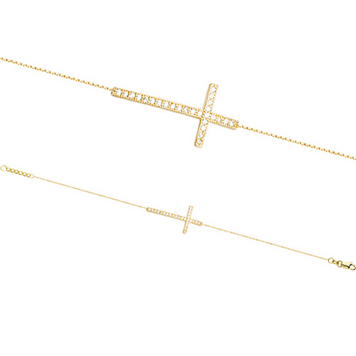 Sideways cross is decorated with white cubic zirconia accents and is made of polished, solid 14kt white gold. Cross is attached to an adjustable bracelet, 7in to 7 1/2in length. Lobster clasp. Item weight: 2.5 grams. Imported.