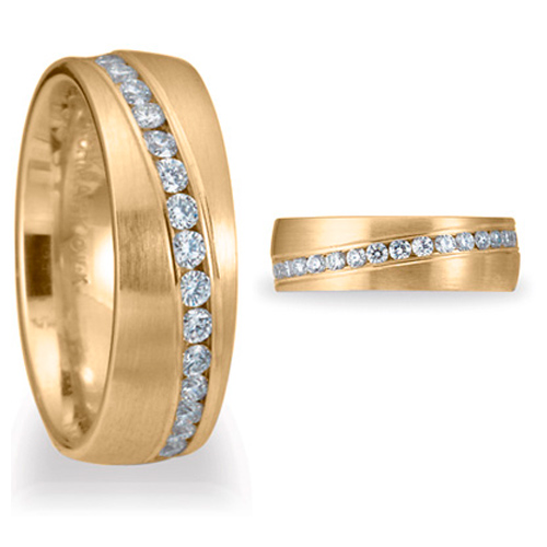 This men's 14k yellow gold satin finish wedding band has a curved channel of 3/4 carat total weight round diamonds. Ring width: 6mm. 36 x .02CT round brilliant diamonds. Diamond color G, clarity SI1. Prong set diamonds go all the way around the ring. Die struck and comfort fit. Made in USA.