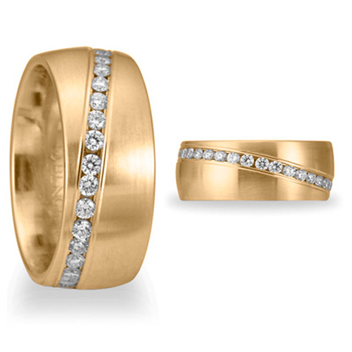 This wide men's 14k yellow gold satin finish wedding band has a curved channel of 3/4 carat total weight round diamonds. Ring width: 8mm. 36 x .02CT round brilliant diamonds. Diamond color G, clarity SI1. Prong set diamonds go all the way around the ring. Die struck and comfort fit. Made in USA.