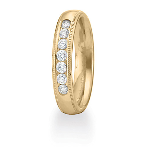 This ladies' 1/4 carat, 7-stone diamond wedding band is crafted in 14k yellow gold with milgrain edges. Ring width: 4mm. 7 x .04CT round brilliant diamonds. Diamond color G, clarity SI1. Channel set diamonds are carefully matched and subject to stringent inspection. Die struck and comfort fit. Made in USA.
