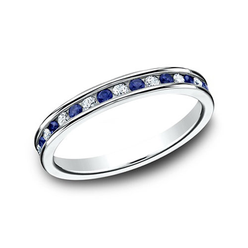 This ladies' blue sapphire and diamond wedding band is made of 14k white gold. Ring width: 3mm. Diamond color G, clarity SI1. Channel set sapphires and diamonds go all the way around. 19 x .02 ct diamonds and 19 x .02 ct sapphires. Die struck and standard fit. Made in USA.