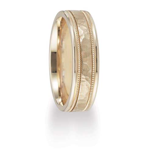 This men's 14k yellow gold wedding band has a flat hammered center and polished milgrain edges. Die struck and comfort fit. Ring width: 6mm. Ring thickness: 1.9mm. This ring is made from 100% recycled gold, sourced directly from suppliers with Scientific Certification Services recycled content certification. Made in USA.