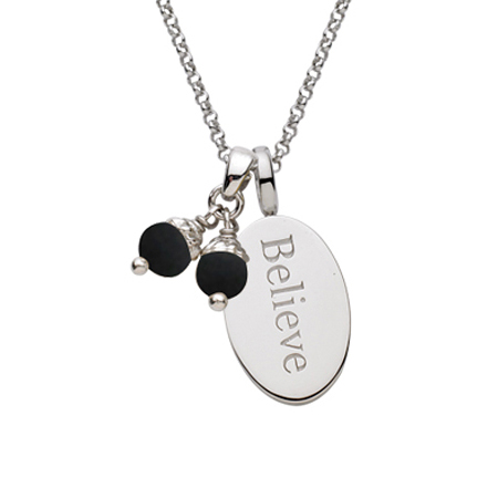 Sterling silver cable chain necklace features Believe oval pendant and black freshwater cultured pearls. Cable chain width: 1.0mm, length: 18in. This necklace is part of the Ones We Love jewelry collection.