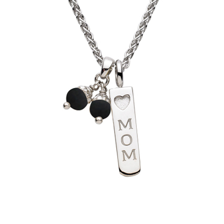 Necklace features a sterling silver MOM pendant and two black 4mm cultured pearls. Pendant dimensions: 20mm x 5mm, slightly larger than a penny. Wheat chain width: 1.5mm, length: 18in. This necklace is part of the Ones We Love jewelry collection.