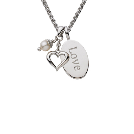 Sterling silver wheat chain necklace features an oval Love pendant, open heart charm, and a white freshwater cultured pearl. Rounded wheat chain width: 1.5mm, length: 18in. This necklace is part of the Ones We Love jewelry collection.