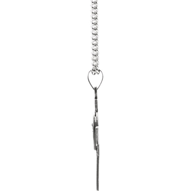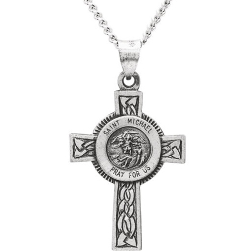 St Michael cross is made of antiqued sterling silver. Dimensions: 1 1/8in x 7/8in. Inscription reads: SAINT MICHAEL PRAY FOR US. 24in sterling silver curb chain. Weighs 2.18 grams. Please note: weight is approximate.