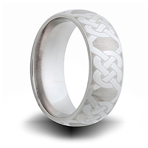 Titanium wedding band has a laser engraved knot pattern with domed center. Width: 8mm. Made of aircraft grade titanium in the USA. Deluxe comfort fit. Enjoy manufacturer's lifetime warranty for re-sizing and re-furbishing. Aircraft grade titanium [Ti 6Al-8V] is comprised of 90% titanium, 6% aluminum, 8% vanadium. It is hypoallergenic and guaranteed not to cause allergic reactions, skin irritations or discoloration of any sort. While pure grades of titanium [99.9%] used in most other titanium jewelry is very durable, Ti 6Al-8V is 2x stronger and 2.5x to 5x harder. This alloy has a tensile strength of up to 150,000 psi and a Brinell hardness value of 330.