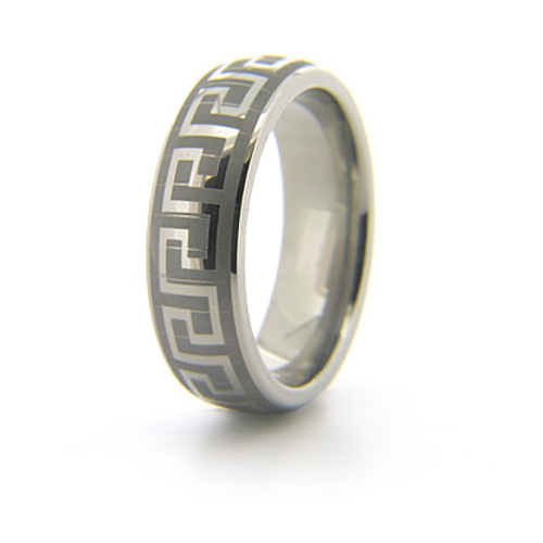 Titanium wedding band has a Greek key design with a polished finish and domed center. Laser engraved design. Width: 8mm. Enjoy manufacturer's lifetime warranty for re-sizing and re-furbishing. Made of aircraft grade titanium in the USA. Deluxe comfort fit. Aircraft grade titanium [Ti 6Al-8V] is comprised of 90% titanium, 6% aluminum, 8% vanadium. It is hypoallergenic and guaranteed not to cause allergic reactions, skin irritations or discoloration of any sort. While pure grades of titanium [99.9%] used in most other titanium jewelry is very durable, Ti 6Al-8V is 2x stronger and 2.5x to 5x harder. This alloy has a tensile strength of up to 150,000 psi and a Brinell hardness value of 330.