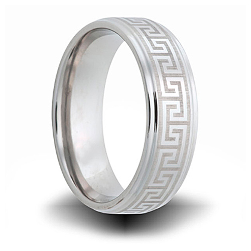 Titanium wedding band has a laser engraved Greek key pattern with rounded edges. Width: 8mm. Deluxe comfort fit. Made of aircraft grade titanium in the USA. Enjoy manufacturer's lifetime warranty for re-sizing and re-furbishing. Aircraft grade titanium [Ti 6Al-8V] is comprised of 90% titanium, 6% aluminum, 8% vanadium. It is hypoallergenic and guaranteed not to cause allergic reactions, skin irritations or discoloration of any sort. While pure grades of titanium [99.9%] used in most other titanium jewelry is very durable, Ti 6Al-8V is 2x stronger and 2.5x to 5x harder. This alloy has a tensile strength of up to 150,000 psi and a Brinell hardness value of 330.