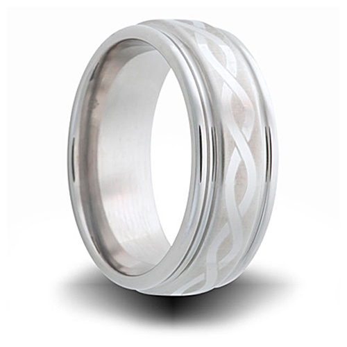 Titanium wedding band has a laser engraved helix pattern with grooved edges. Width: 8mm. Enjoy manufacturer's lifetime warranty for re-sizing and re-furbishing. Made of aircraft grade titanium in the USA. Deluxe comfort fit. Aircraft grade titanium [Ti 6Al-8V] is comprised of 90% titanium, 6% aluminum, 8% vanadium. It is hypoallergenic and guaranteed not to cause allergic reactions, skin irritations or discoloration of any sort. While pure grades of titanium [99.9%] used in most other titanium jewelry is very durable, Ti 6Al-8V is 2x stronger and 2.5x to 5x harder. This alloy has a tensile strength of up to 150,000 psi and a Brinell hardness value of 330.