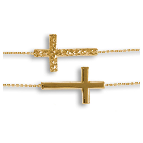Reversible sideways cross is made of polished, solid 14kt yellow gold. 3/4in cross is attached to an adjustable rope chain, 16in to 18in length. Chain width: .5mm. Item weight: 2.45 grams. Imported.