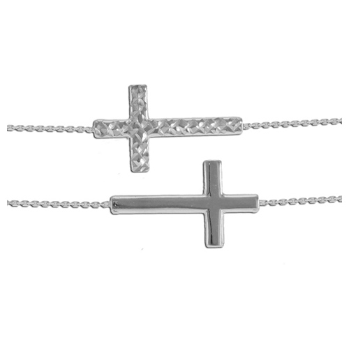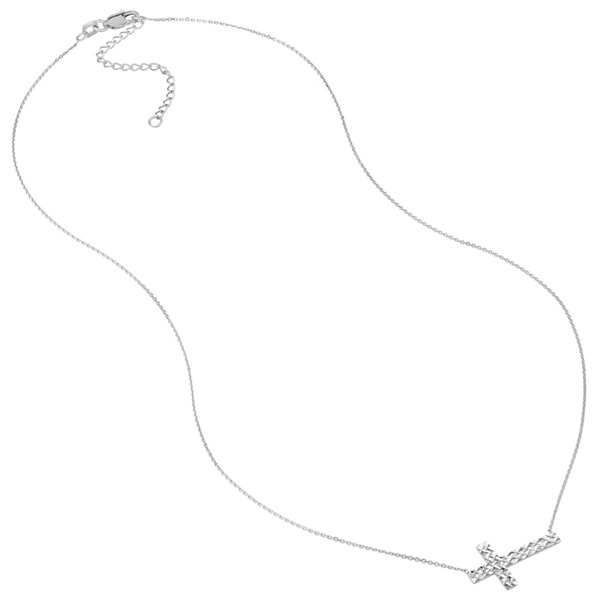 Reversible sideways cross is made of polished, solid 14kt white gold. 3/4in cross is attached to an adjustable rope chain, 16in to 18in length. Chain width: .5mm. Item weight: 2.0 grams. Imported.