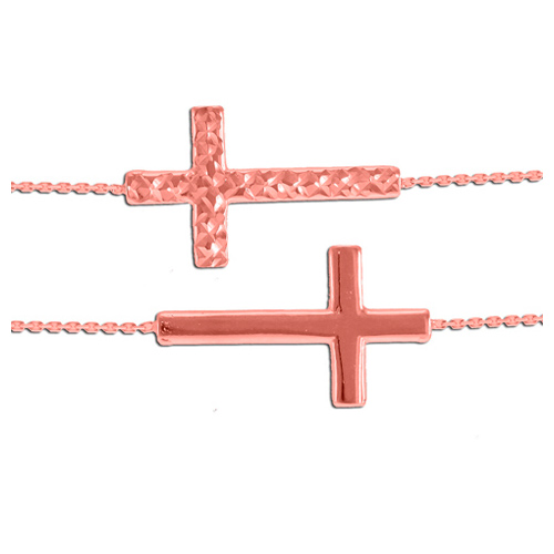 Reversible sideways cross is made of polished, solid 14kt rose gold. 3/4in cross is attached to an adjustable rope chain, 16in to 18in length. Item weight: 2.0 grams. Imported.