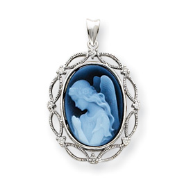 Wings of love cameo pendant with diamonds is made of 14k white gold. .12 carat total weight diamond accents. This oval blue agate cameo pendant is set in an open back, 14kt white gold frame. Item dimensions: 18mm x 13mm. Chain not included. Part of the Wings of Love™ cameo collection.