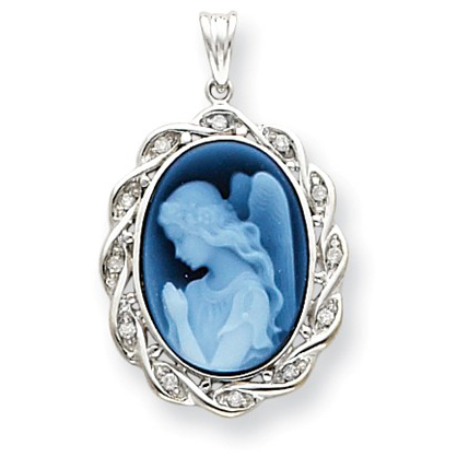 14k white gold Wings of love cameo pendant is made of blue agate and decorated with 12 round diamond accents. This oval cameo pendant is set in an open back frame. Item dimensions: 18mm x 13mm. 0.12 carat total weight diamonds. Part of the Wings of Love cameo collection.