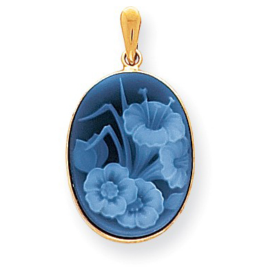 Laser carved, genuine blue agate cameo depicts four flowers. This oval cameo pendant is set in an open back, 14kt yellow gold frame. Item dimensions: 20mm x 15mm. Chain not included.