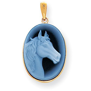 Laser carved, genuine blue agate cameo depicts a horse in profile. This oval cameo pendant is set in an open back, 14kt yellow gold frame. Item dimensions: 20mm x 15mm. Chain not included.
