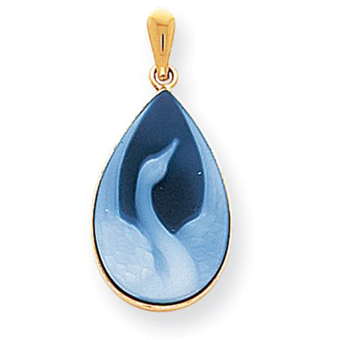 Laser carved, genuine blue agate cameo depicts a swan with outstretched wings. This oval cameo pendant is set in an open back, 14kt yellow gold frame. Item dimensions: 18mm x 13mm. Chain not included.