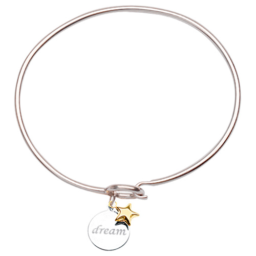 This sterling silver Dream disc bangle bracelet features a 1/4in hollow 14kt yellow gold star charm. Disc diameter: 1/2in, half the size of a quarter. Bangle fits wrist sizes up to 8in. Item weight: 7.6 grams. Import.